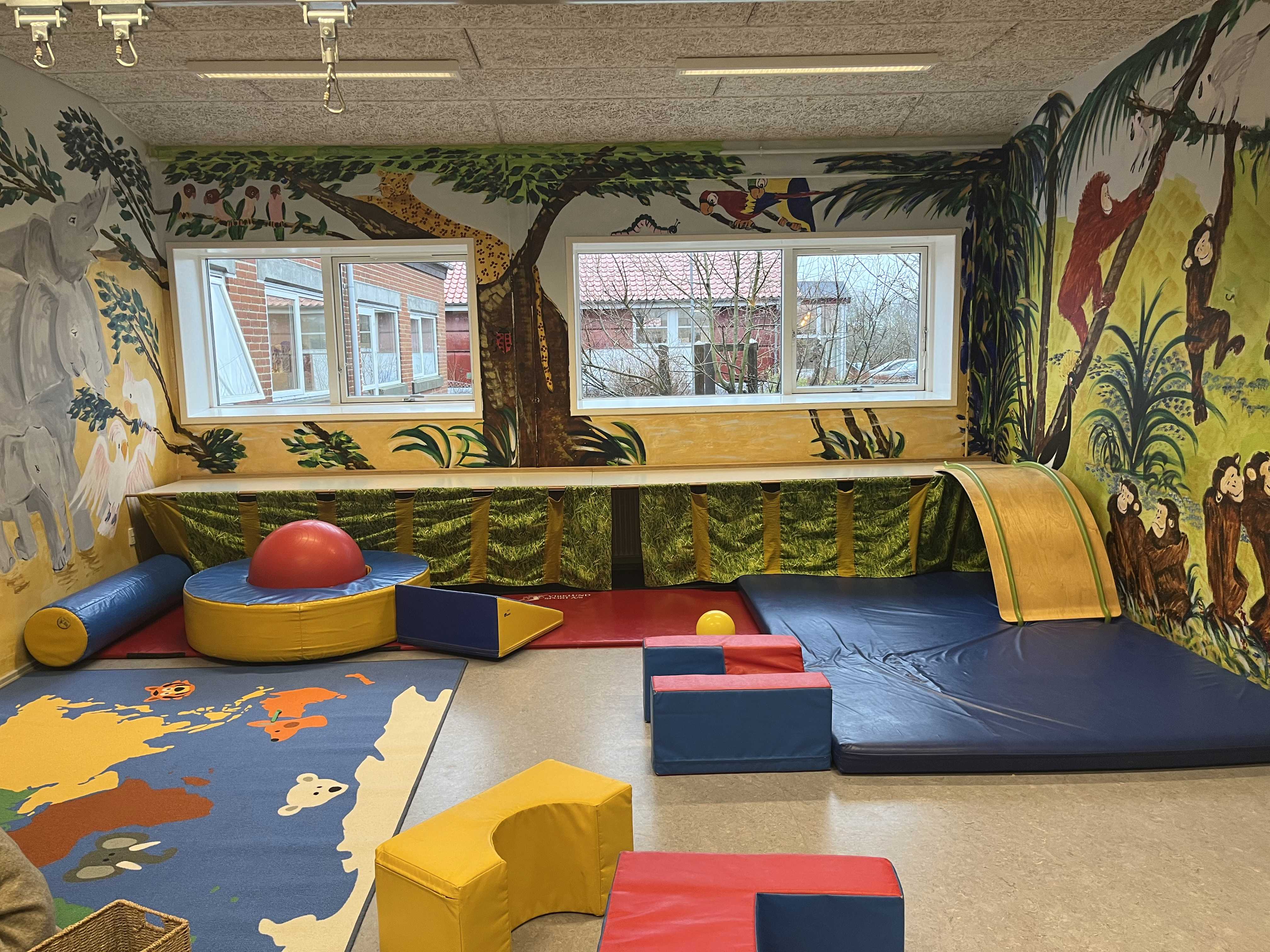 Vuggestuen er et lyst og indbydende hus, der er indrettet med tre aldersintegrerede stuer, samt et stort dejligt fællesrum i midten af huset, med flotte vægmalerier, så man føler sig hensat til Afrikas savanne.